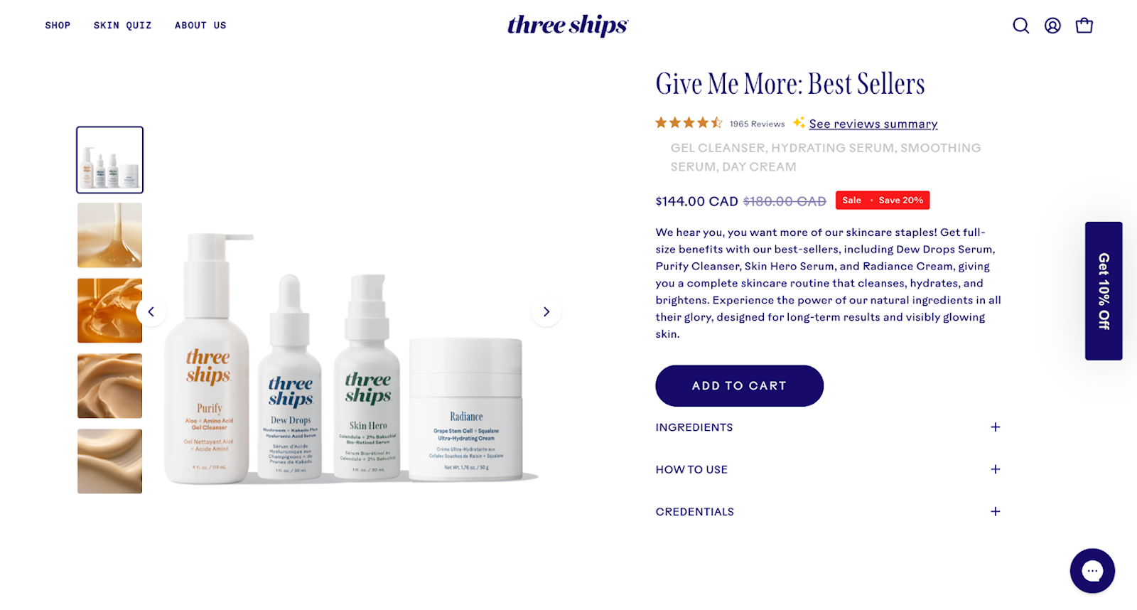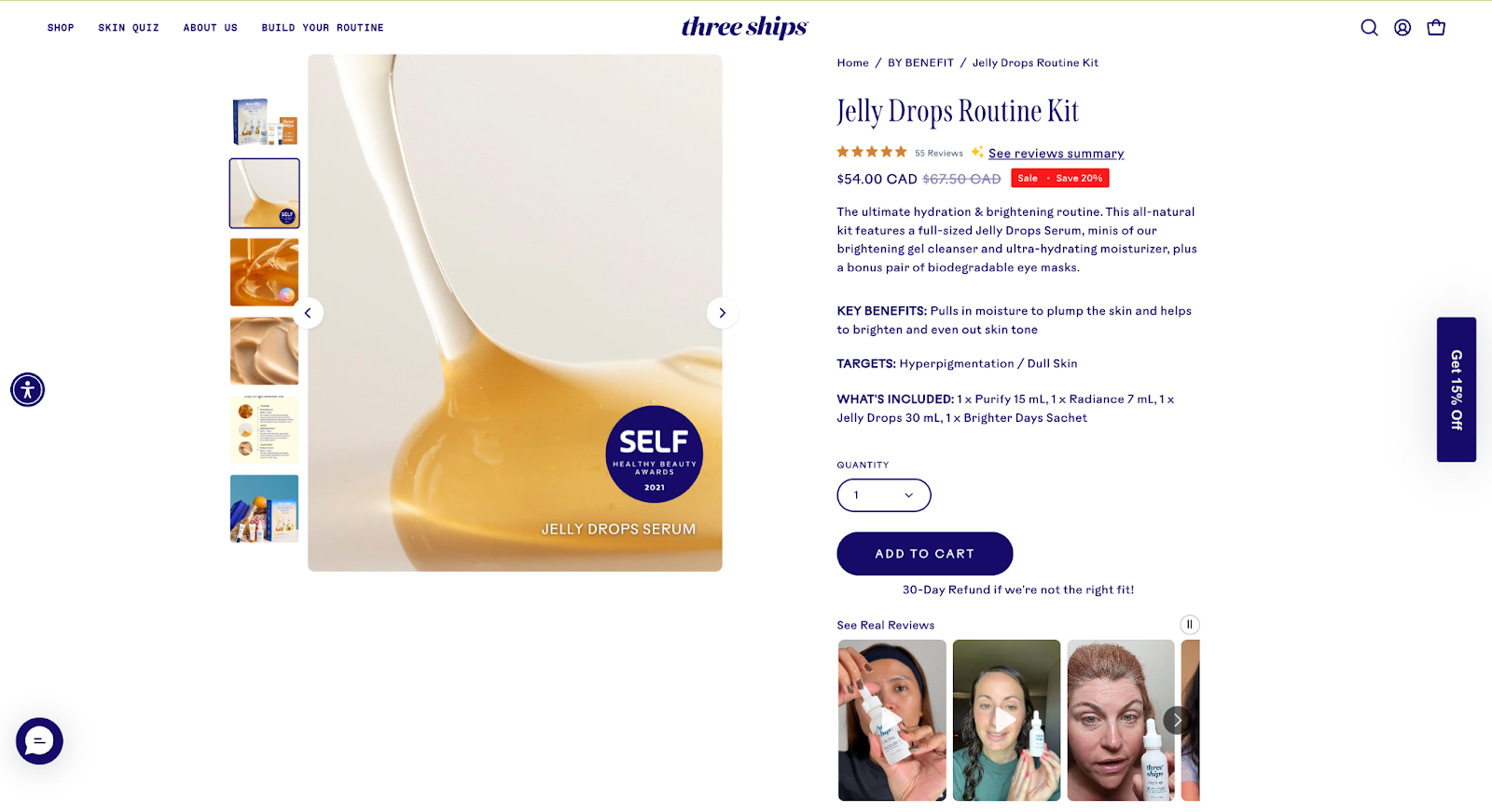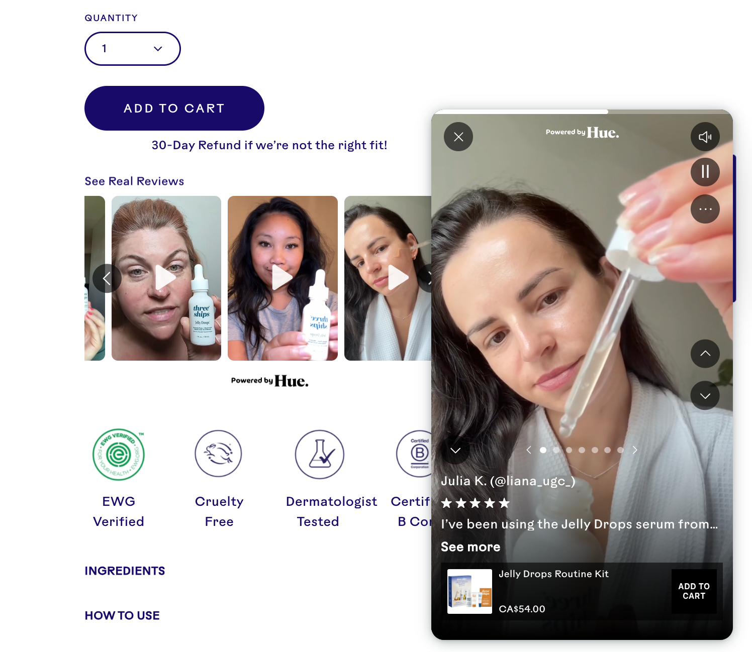 Three Ships does all of the above. Their site features a “Healthy Beauty Awards” badge directly on product images. Refund policies are displayed under CTAs, and UGC is showcased on product pages. This type of messaging builds trust by combining authority signals with authentic content marketing.