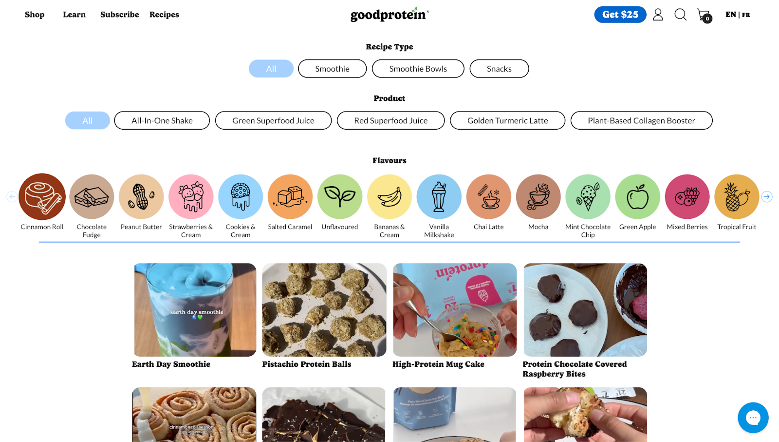 Here’s an example from Good Protein’s recipe’s page, where you can filter by recipe type, product, and even flavor.