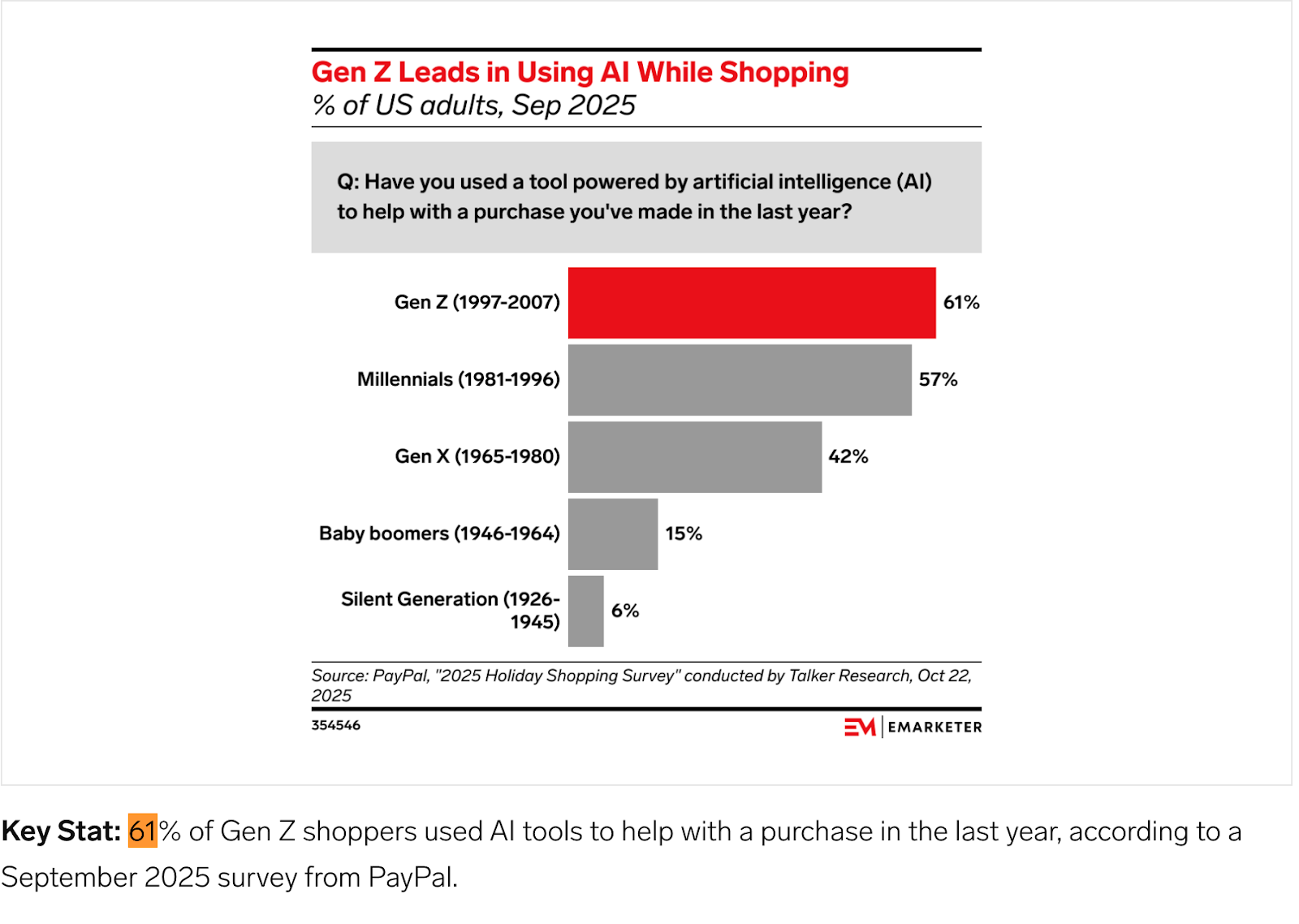 Younger shoppers are already leaning into this behavior. In a recent survey, 61% of Gen Z consumers said they’ve used AI tools to help with a purchase in the past year.