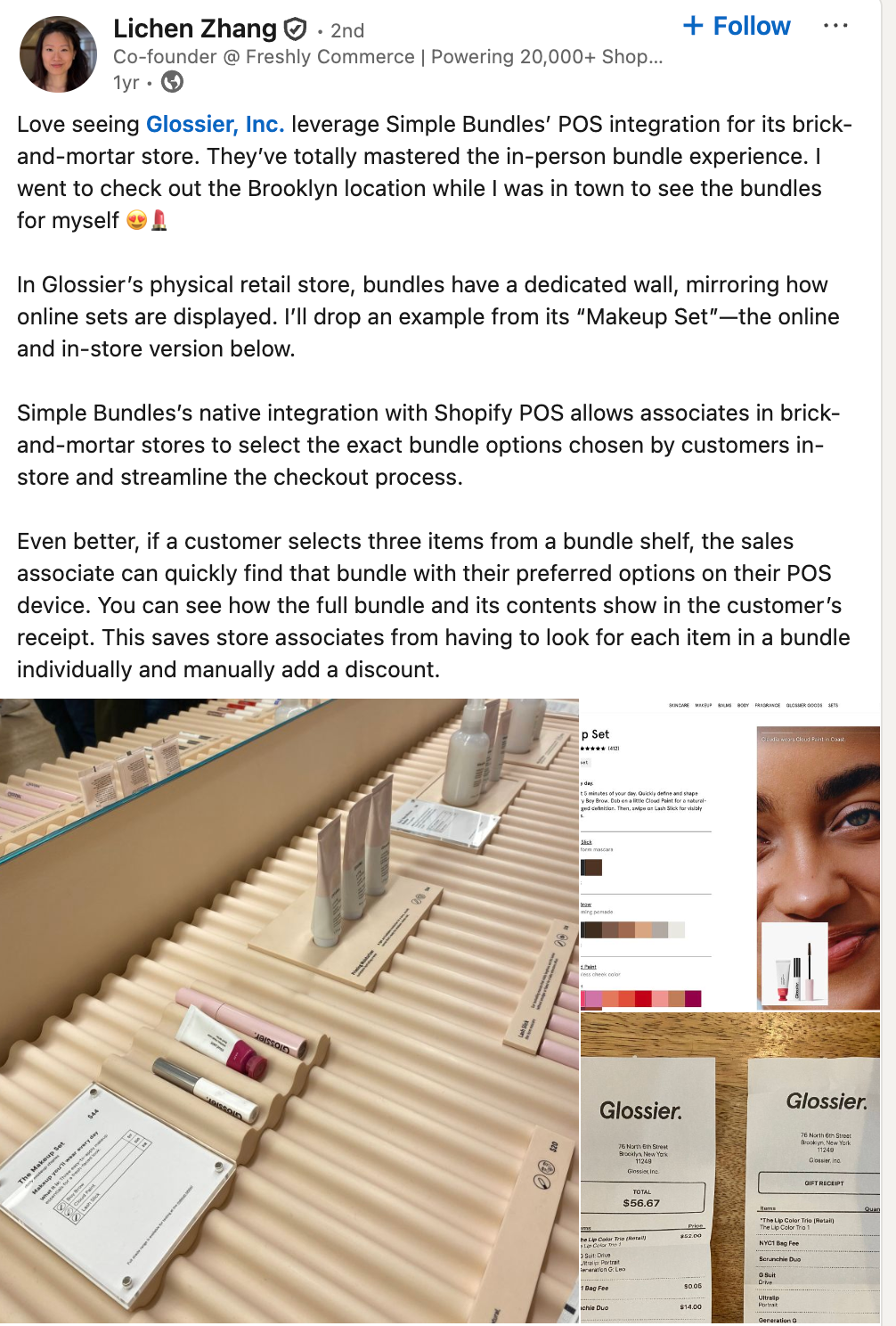 According to Freshly Commerce’s Co-founder, Lichen Zhang, Glossier’s brick-and-mortar stores feature dedicated bundle displays that mirror the sets customers see online. Its “Makeup Set” bundles use the same products, pricing, and presentation whether shoppers are browsing the website or standing in the store.