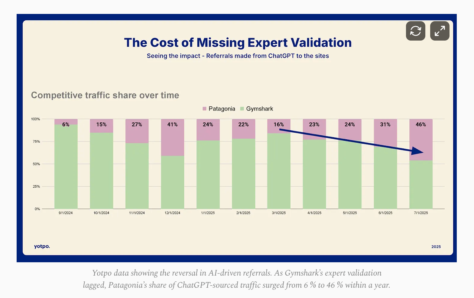 According to Yotpo data shared by Weiss, Patagonia appears in roughly 94% of AI-generated recommendations for outdoor clothing and gear. Referral data tells the same story: traffic from ChatGPT to Gymshark’s site dropped from 94% to just over 50% in the past year, while Patagonia climbed from 6% to 46%.