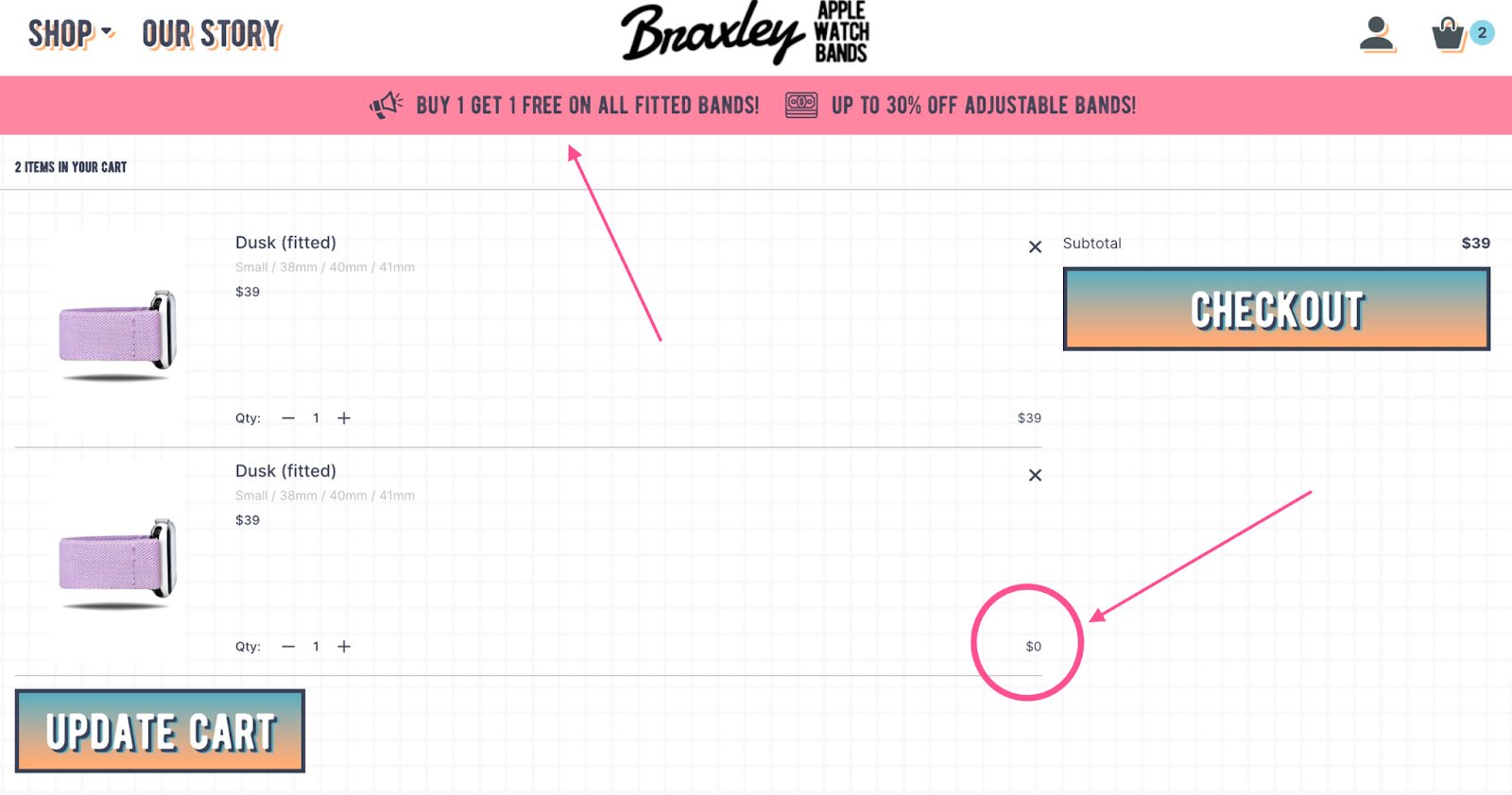 Check out this example from Braxley Bands, where you can see how the second band is shown as $0.