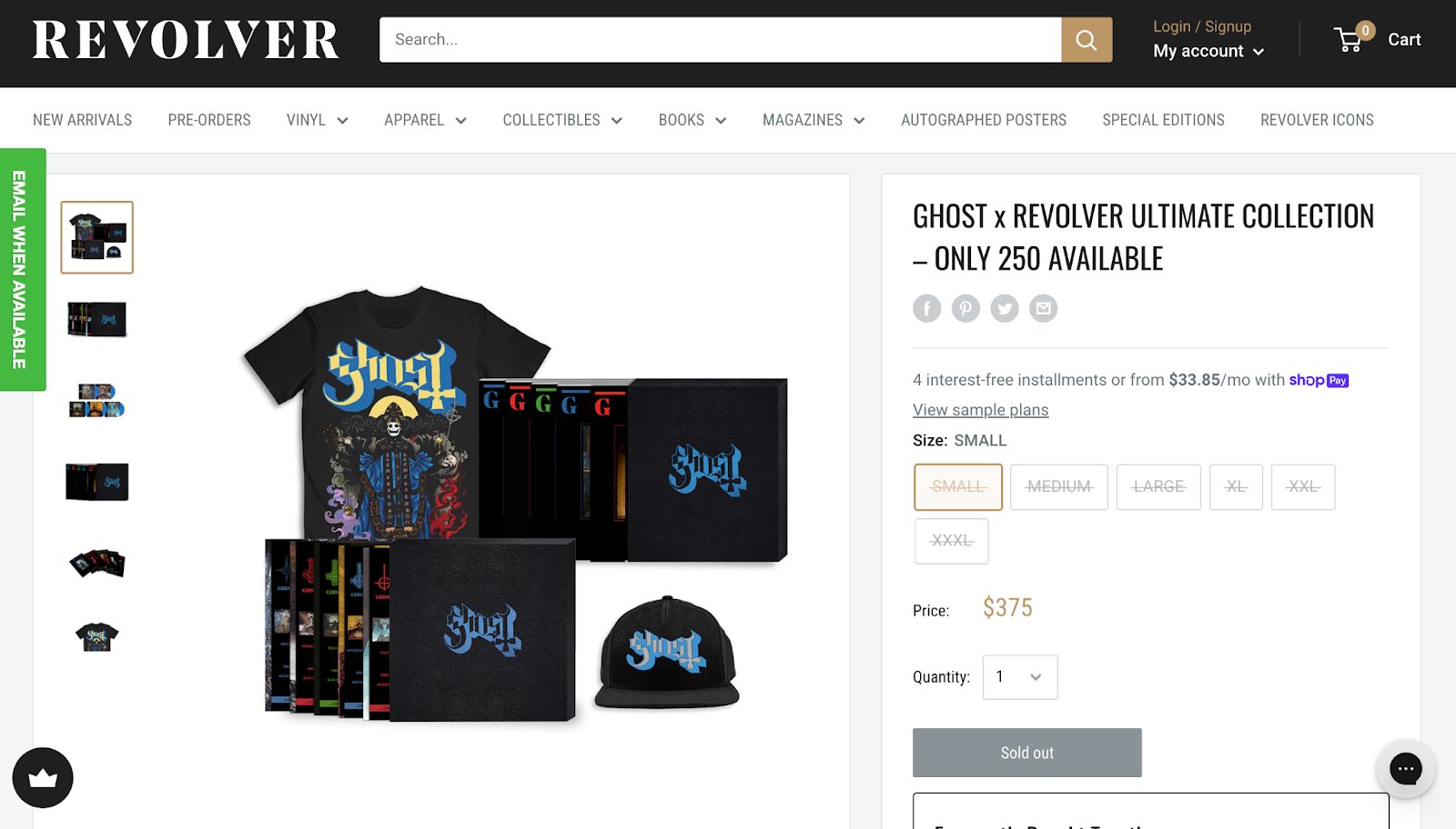 Revolver Mag teams up with bands to create exclusive bundles often. In partnership with the band Ghost, the bundle sold out within days. You can see right in the bundle title how they share how only 250 are available.