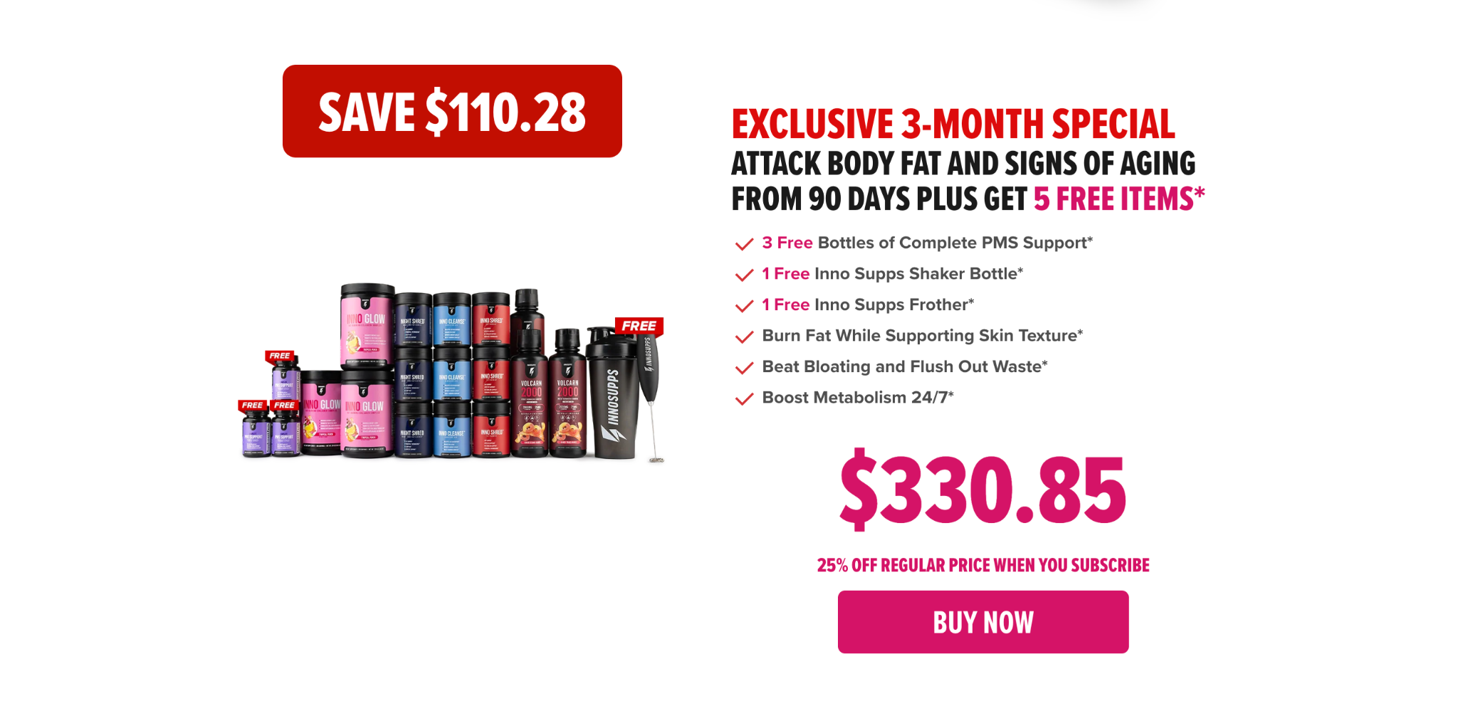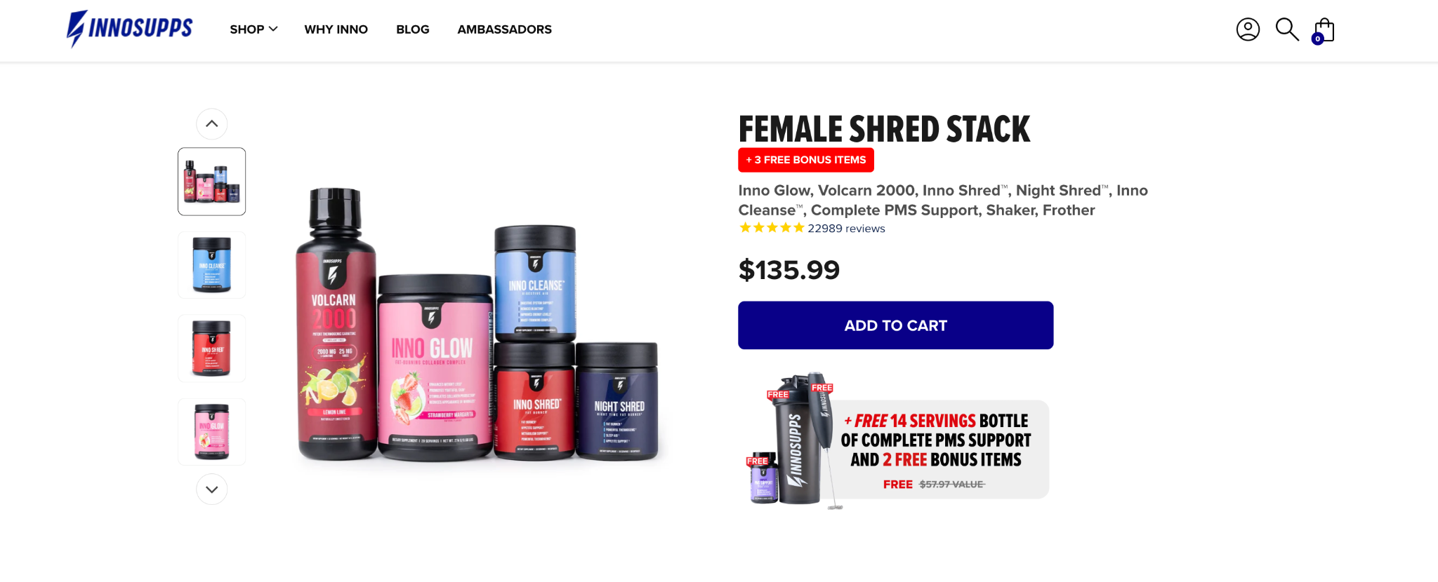 INNOSUPPS does this on its “female shred stack.” If a shopper purchases, they also get 14 free servings of PMS support, a shaker bottle, and two more bonus items.