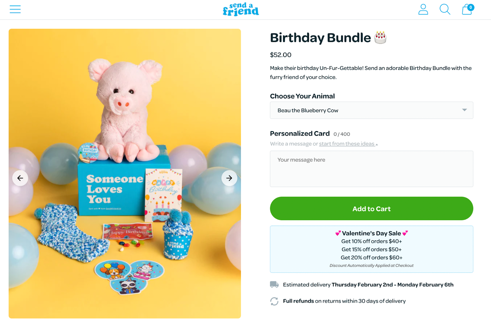 Send A Friend also uses a birthday bundle to package the stuffed animal, stickers, buttons, socks, a birthday card, and more, which makes it super convenient for customers to send a gift to a friend.
