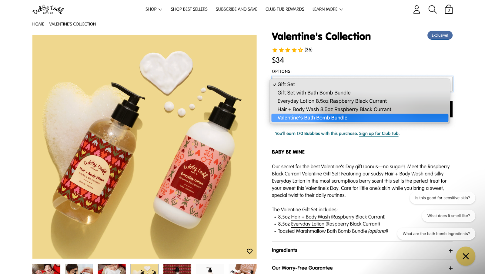 They sell bath-related products—creams, body washes, bubble bath, and more—and put together a Valentine’s Day collection featuring body wash and lotion. Shoppers can then choose to upgrade the bundle by adding items like bath bombs.