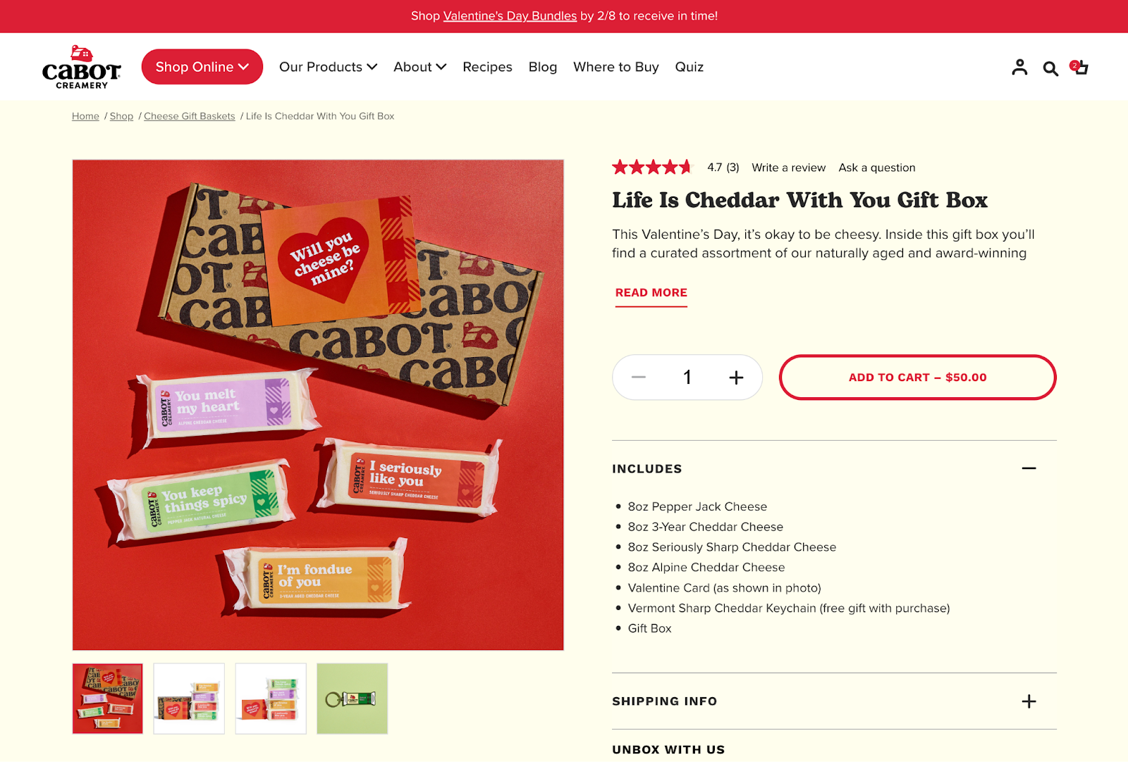 Cabot Creamery went with a more traditional bundle style: a Valentine’s Day gift box with a playful pun: “Life is chedder with you.”