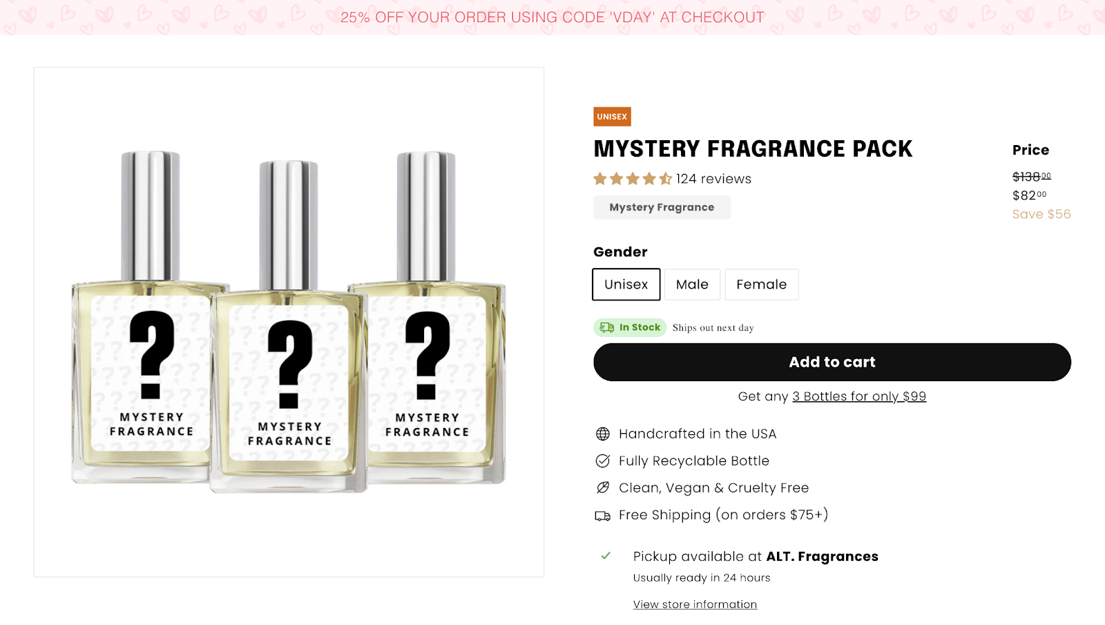 ALT also promotes a ton of bundle types, but one that really stands out is their mystery pack. The only thing the customer selects is whether they’re shopping for men, women, or unisex. Everything else is up to the brand.