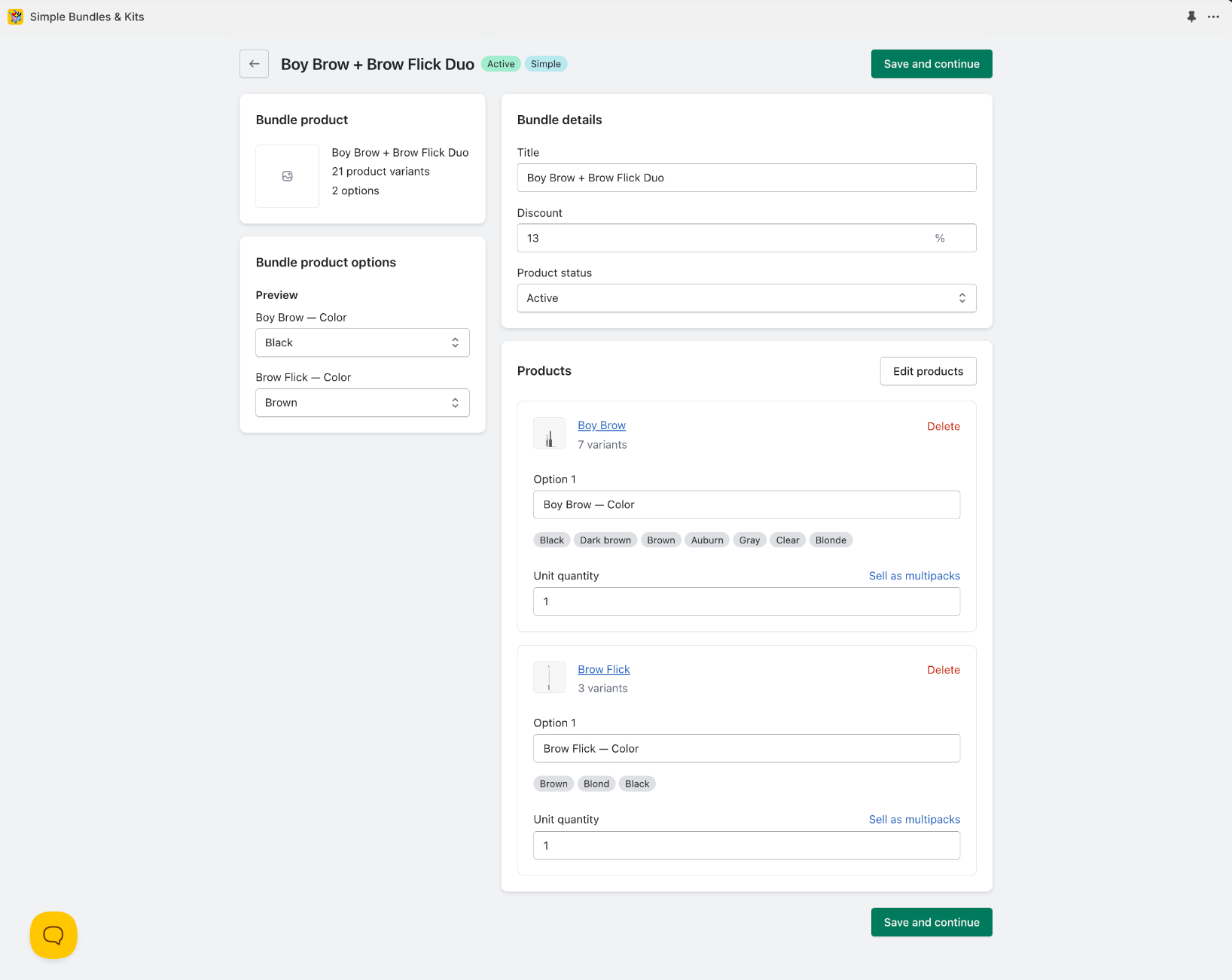 Add details to your new bundle product and include the individual items (Boy Brow and Brow Flick) in your bundle. Later, you can edit your bundle properties, such as the bundle image, just as you would for any Shopify product. Click "Save and continue".