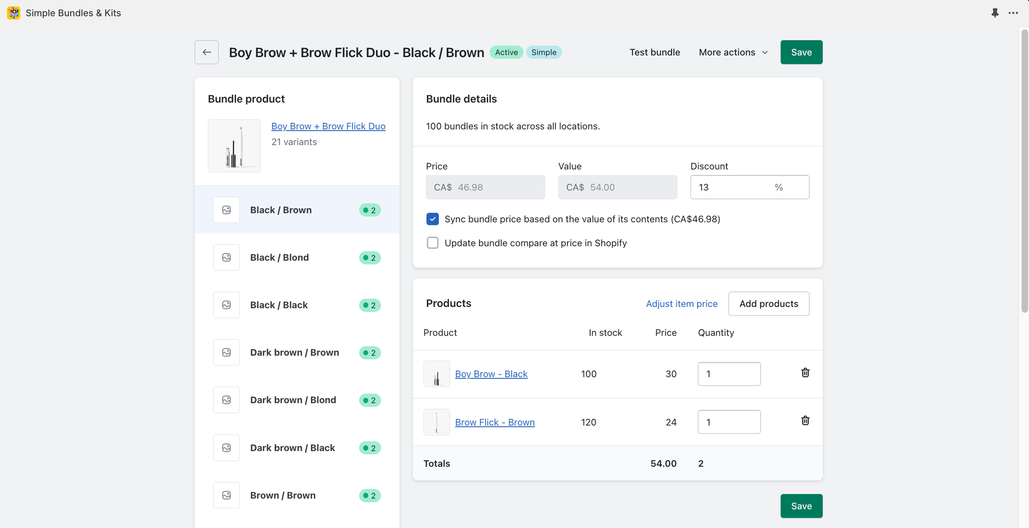 Use a Simple bundle if your bundle has fewer than 100 total variants (e.g., Boy Brow + Brow Flick Duo with 21 combinations).
