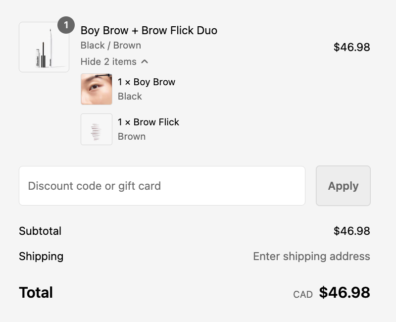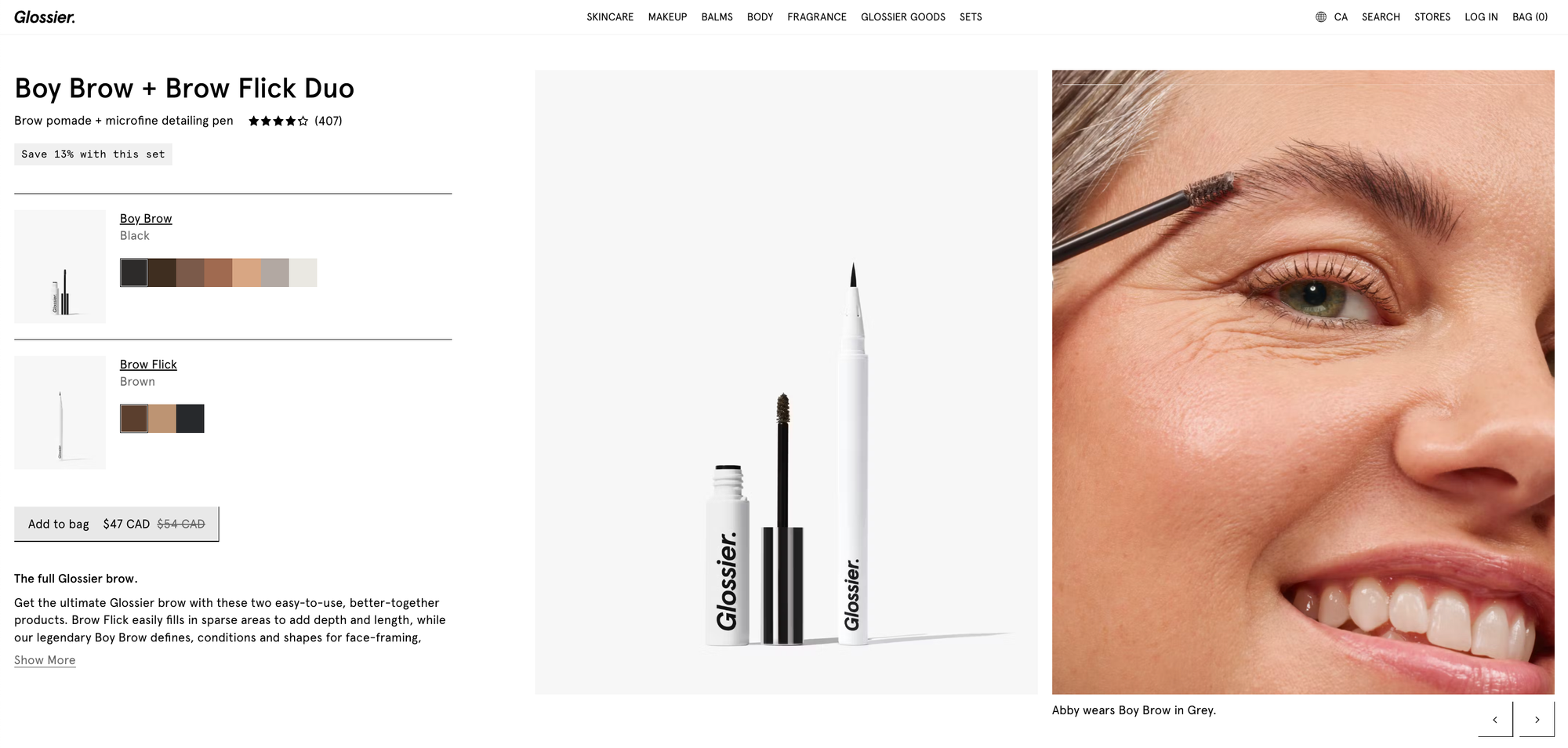 A simpler mix-and-match bundle, like the Boy Brow + Brow Flick Duo, includes 7 shades of Boy Brow and 3 shades of Brow Flick, resulting in 21 unique combinations.