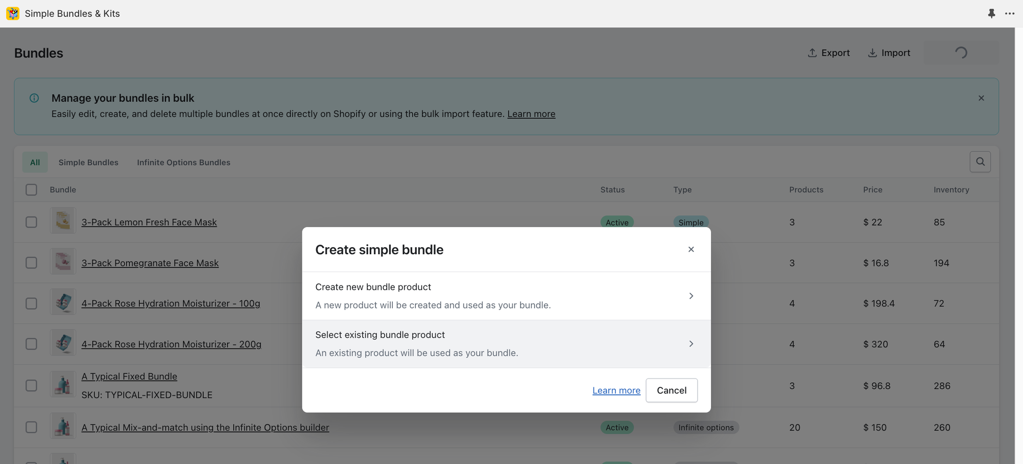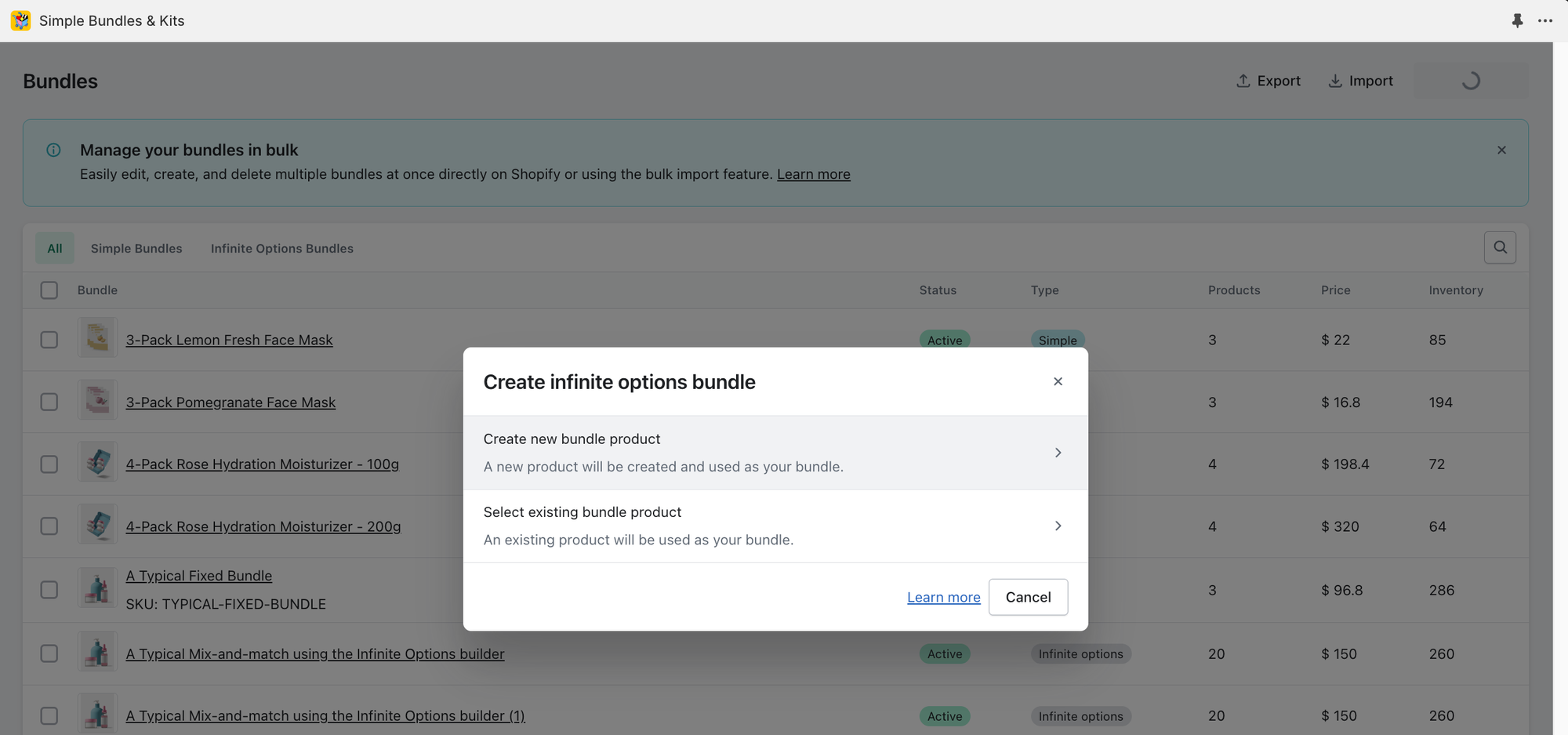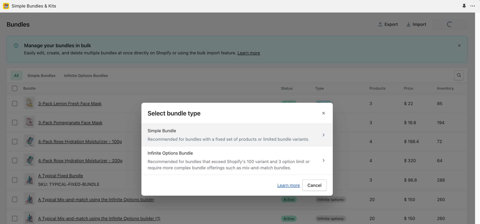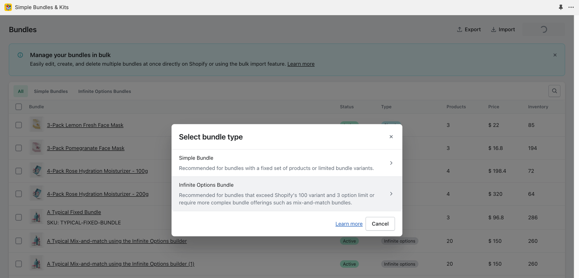 First, select the type of mix-and-match bundle you want to create. Choose a Simple bundle if you have fewer than 100 variants, and an Infinite options bundle if you have more than 100 variants or more than 3 options.