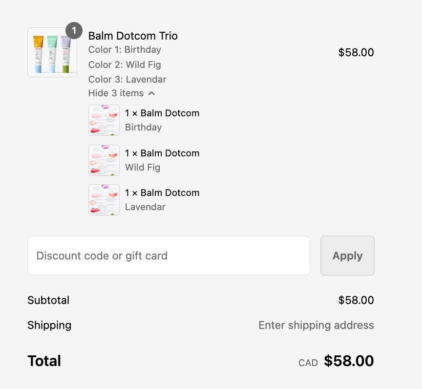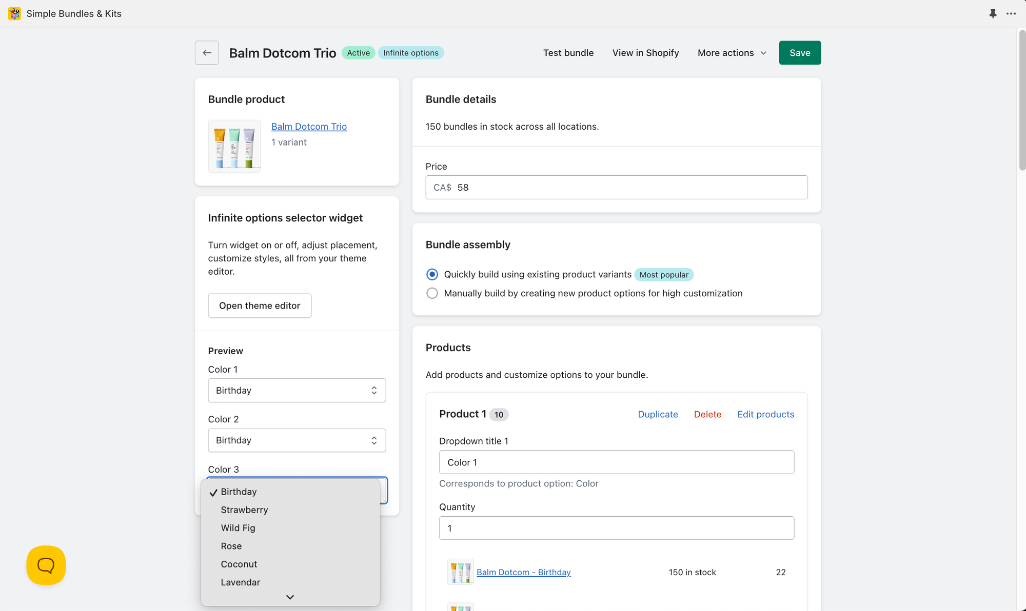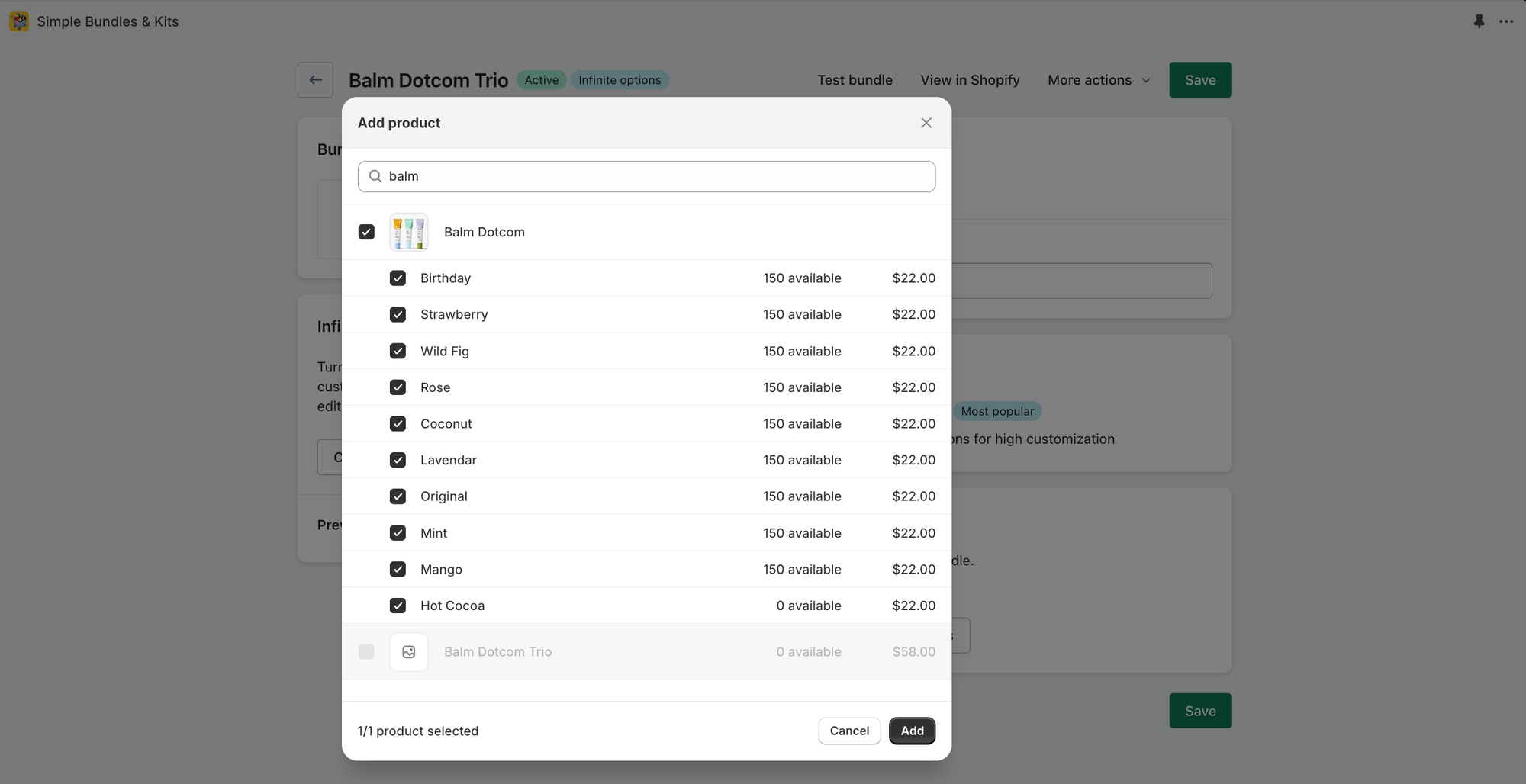 Use an Infinite options bundle if your bundle exceeds Shopify’s 3 options / 100 variants limit (e.g., Balm Dotcom Trio with 1,000+ combinations).